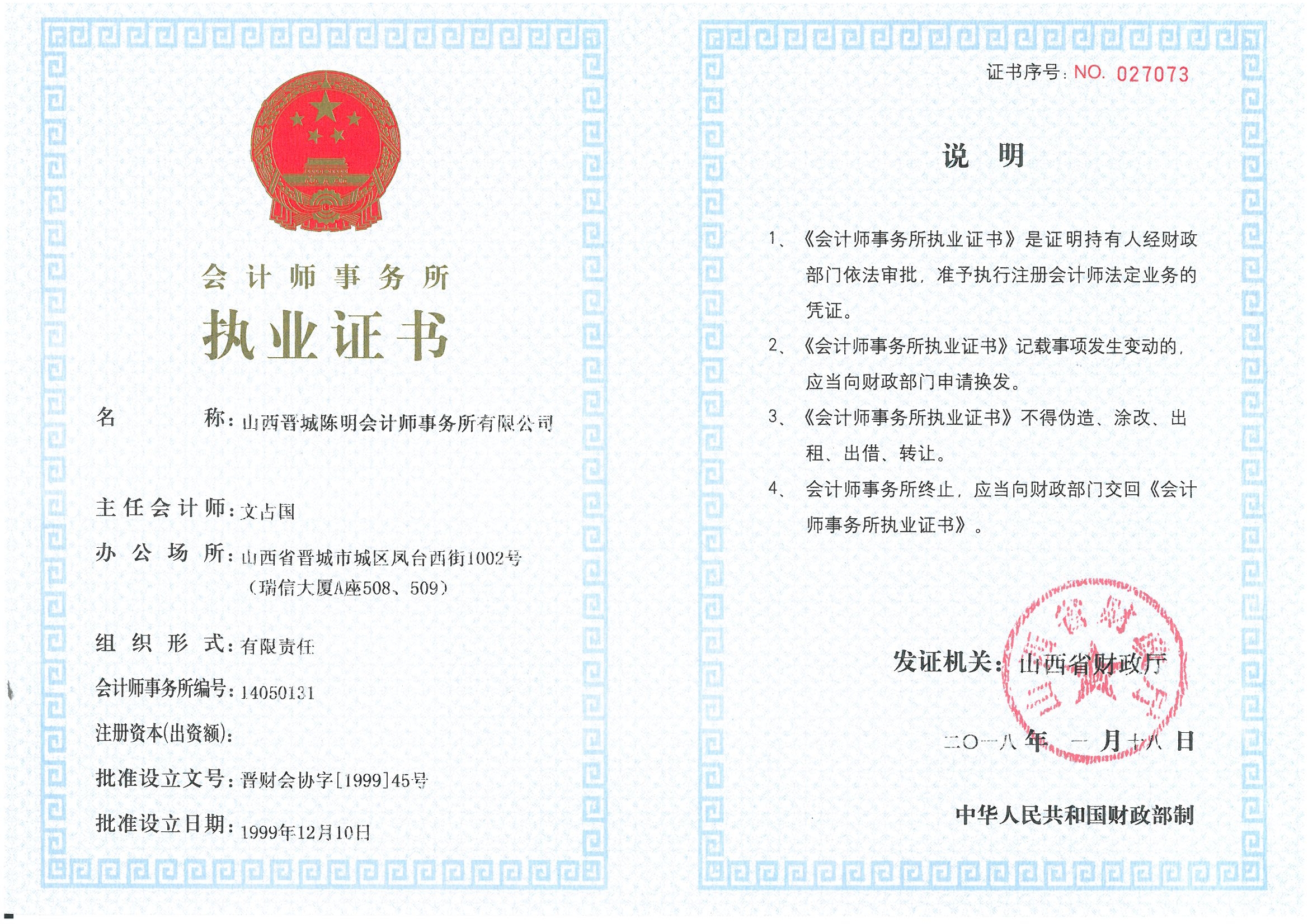 會計師事務所執(zhí)業(yè)證書