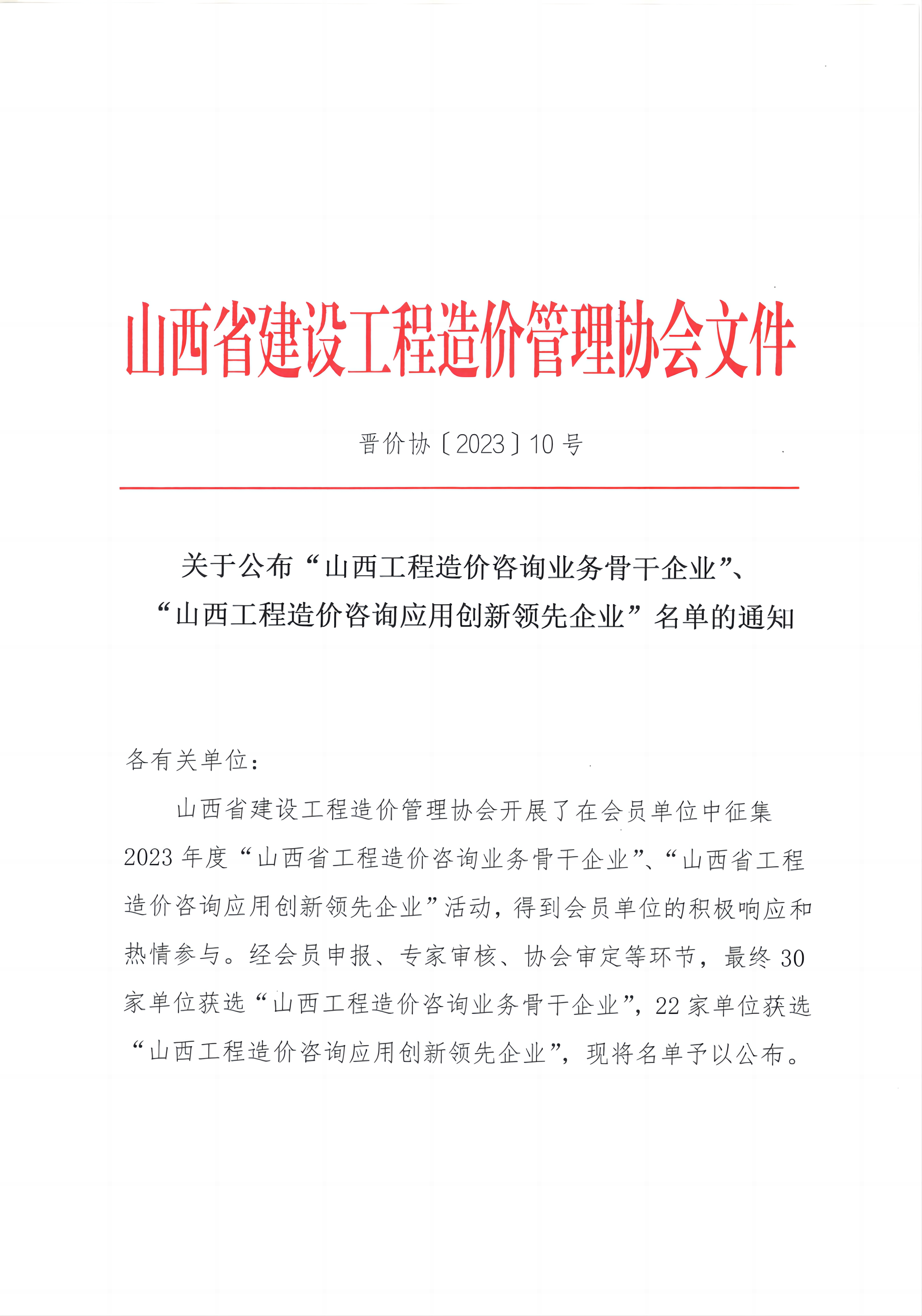 2023年,省價(jià)協(xié)開(kāi)展2023年度“山西省工程造價(jià)咨詢業(yè)務(wù)骨干企業(yè)”、“山西省工程造價(jià)咨詢應(yīng)用創(chuàng)新領(lǐng)先企業(yè)"活動(dòng),我公司積極參與申報(bào),經(jīng)省價(jià)協(xié)初審、專家評(píng)審,最終,我公司入選2023年度“山西省工程造價(jià)咨詢業(yè)務(wù)骨干企業(yè)”。